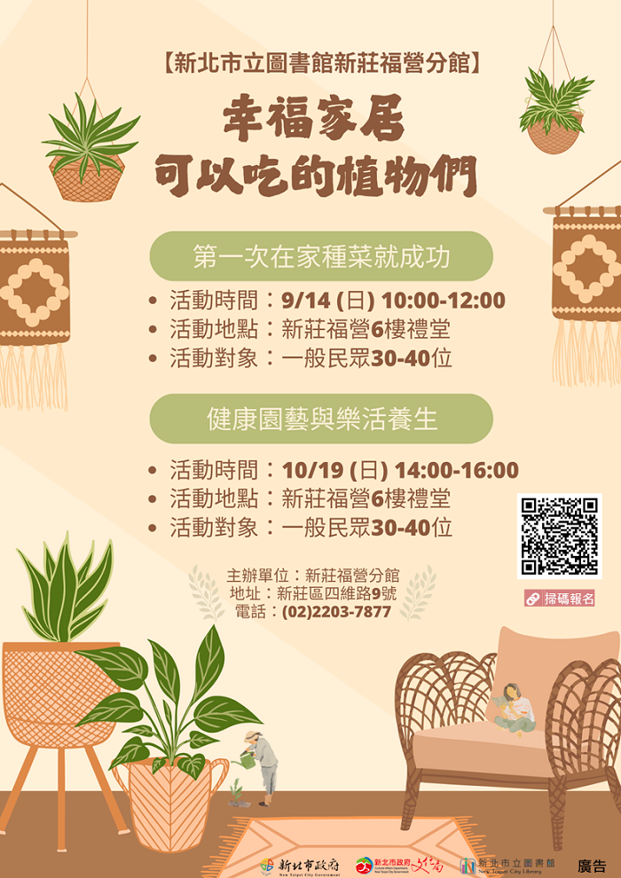 【新莊福營分館】114年綠色居家-生活園藝講座 主打適合全年齡讀者的綠色講座,提倡從生活中尋找樂趣, 打造屬於你的綠色小天地! 此系列教你如何讓健康園藝成為日常,零經驗也能一次成功, 享受從種植到收成的成就感,一起樂活養生、幸福生活! ------------------------活動資訊--------------------------------- 【第二場】健康園藝與樂活養生 (一) 活動時間:10/19 (日) 14:00-16:00 (二) 活動對象:持新北市立圖書館借閱證之讀者,約30-40位 (三) 活動講師:吳俊偉 老師 (幽默風趣的德霖科大園藝系助理教授) (四) 活動地點:新莊福營分館 六樓大禮堂 (新莊區四維路9號) (五) 報名網址:https://reurl.cc/1OG4NG (預計10/3中午12:30開放) 本館保留變更活動內容權利,如有變動以新北市立圖書館官方網站公告為準。