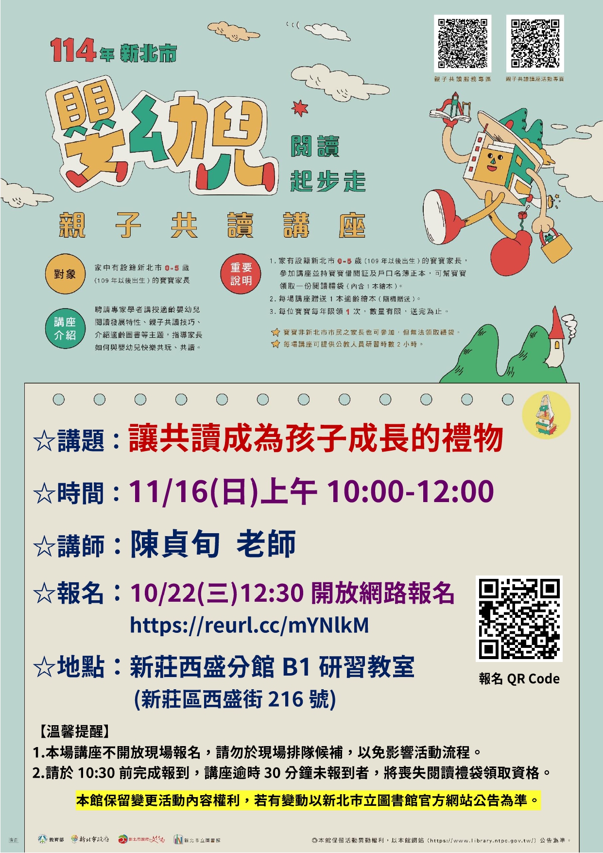 📚【11/16親子共讀講座】讓共讀成為孩子成長的禮物🌷 陪孩子一起閱讀,不只是共度時光,更是送給他們最珍貴的成長禮物。 本次講座邀請幼兒教育與家庭關係專家——陳貞旬老師,帶領家長認識嬰幼兒閱讀發展特性,學習共讀技巧與適齡選書,讓每次翻頁都成為孩子探索世界的起點。 🕙時間|11/16(日)10:00-12:00 🏠地點|新莊西盛分館B1研習教室(新莊區西盛街216號) 👶對象|設籍新北市0-5歲(109年以後出生)之寶寶家長 🌐報名|https://reurl.cc/mYNlkM 10/22(三)中午12:30開放登記,11/13(四)截止。 📞洽詢|02-2203-5574 西盛分館 🎁參加講座並攜帶寶寶借閱證與戶口名簿正本完成報到,即可領取閱讀禮袋(內含1本繪本)。 ⚠️請於10:30前報到;逾時30分鐘未報到者將喪失領取資格。 💡貼心提醒 ・非新北市設籍寶寶之家長亦可參加,但無禮袋資格。 ・本活動可登錄公教人員研習時數2小時。 ・未提供托嬰服務,建議兩位大人同行。 ・哺乳室使用請至1樓櫃台登記。 👉錄取名單將以官網公告為準:https://www.library.ntpc.gov.tw/singlehtml/ActvInfo?cntId=ed9a3a76f54a474eae1b1e648be770a6#gsc.tab=0 ◎本館保留活動異動權利,以本館網站公告為準。